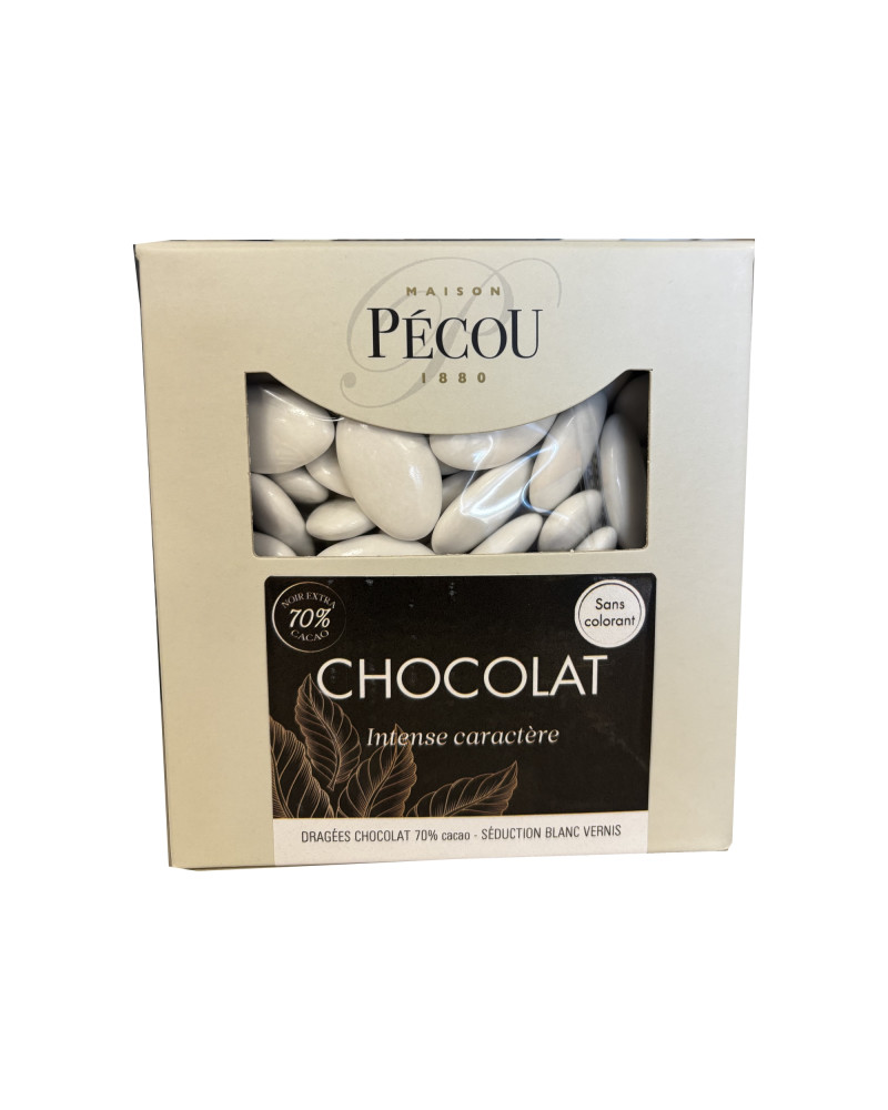 Dragées Pécou séduction au coeur tendre de fin chocolat noir à 70% de cacao couleur blanc vernis - Boîte de 1 kg